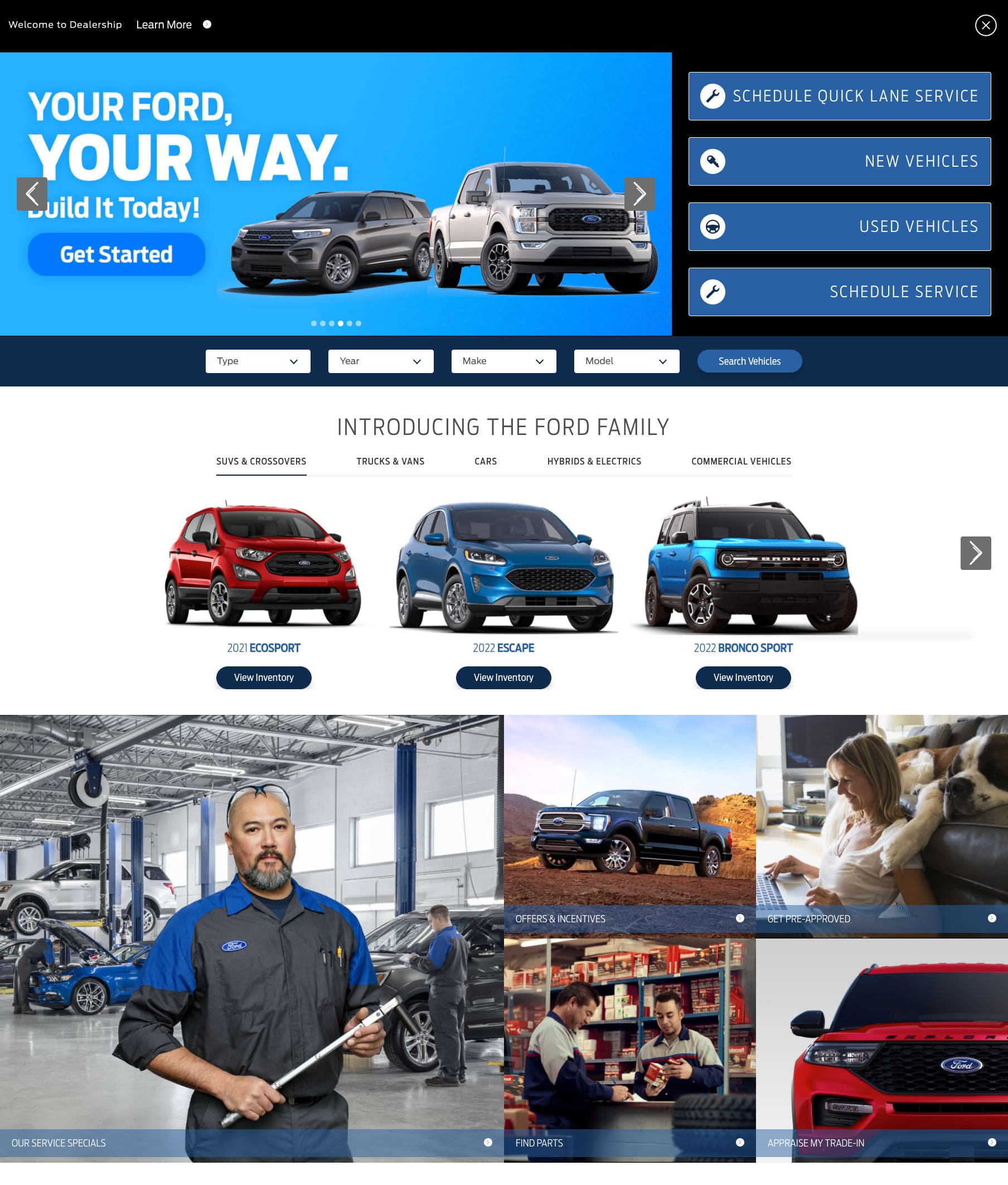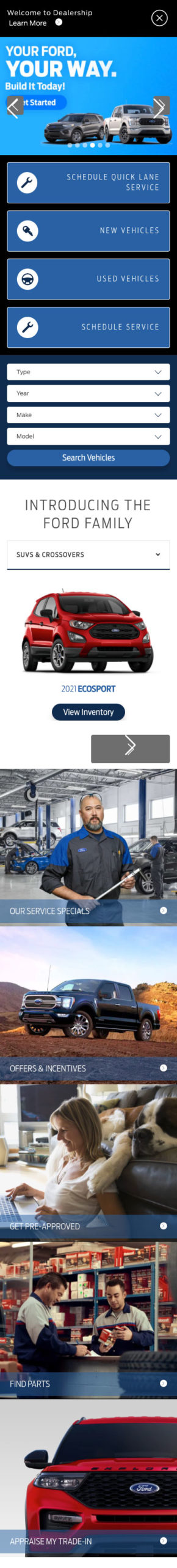 Searching for a new vehicle can be stressful. Our certified dealership works hard to ensure processes are smooth and our customers feel comfortable throughout the whole process. Our team can help you find the vehicle that fits your lifestyle best and will guide you through the purchase process. Once you decide on a vehicle, we will help you find the right parts and accessories to ensure you enjoy your ride. All parts and accessories are approved or made by Ford, meaning whatever product you purchase will fit and perform exactly as Ford intended.